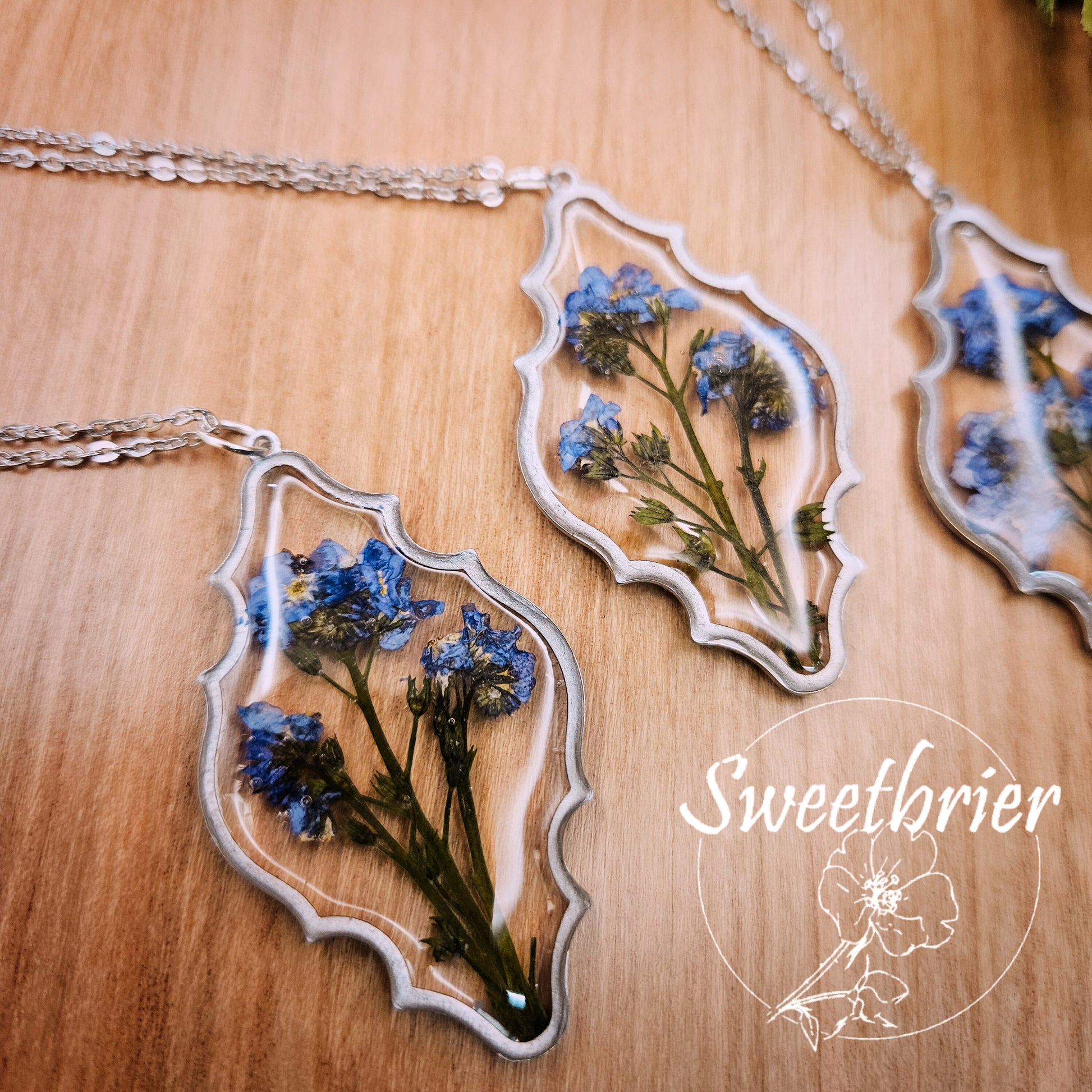 This stunning botanical necklace features real pressed forget-me-not flowers with delicate green foliage preserved in clear resin within an elegant Moroccan-inspired gold or silver-tone frame. The intricate scalloped silhouette adds vintage sophistication while showcasing the natural beauty of the preserved blooms in a wearable garden display.