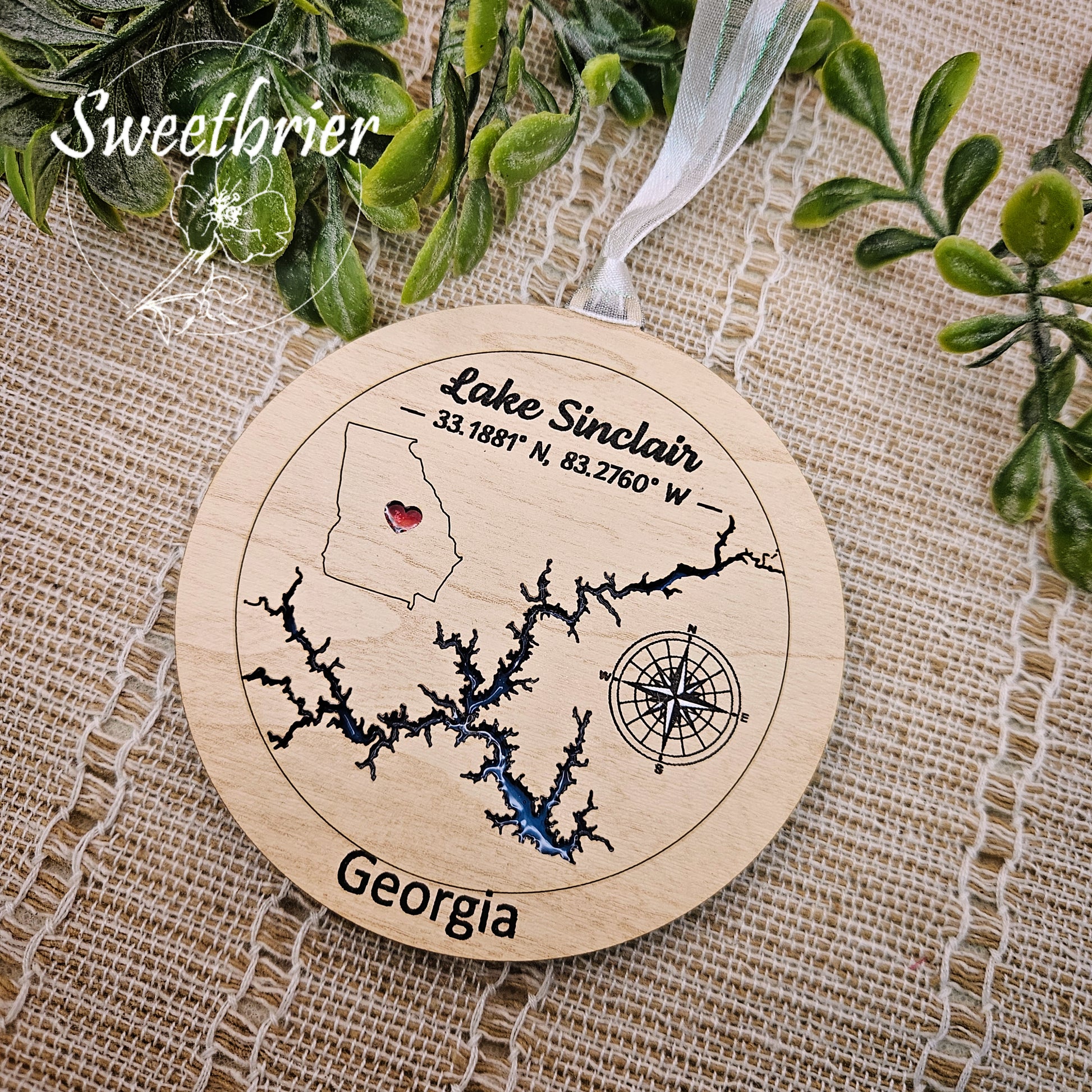 This charming 3.5 inch round Georgia Christmas ornament features a beautifully engraved and painted double-layer design showcasing a map of Lake Sinclair. Crafted from durable Baltic Birch, it adds a unique touch to your holiday decor while celebrating the beauty of Georgia. Perfect for gifting or as a special keepsake, this ornament is sure to bring a smile to anyone who loves the Lake!