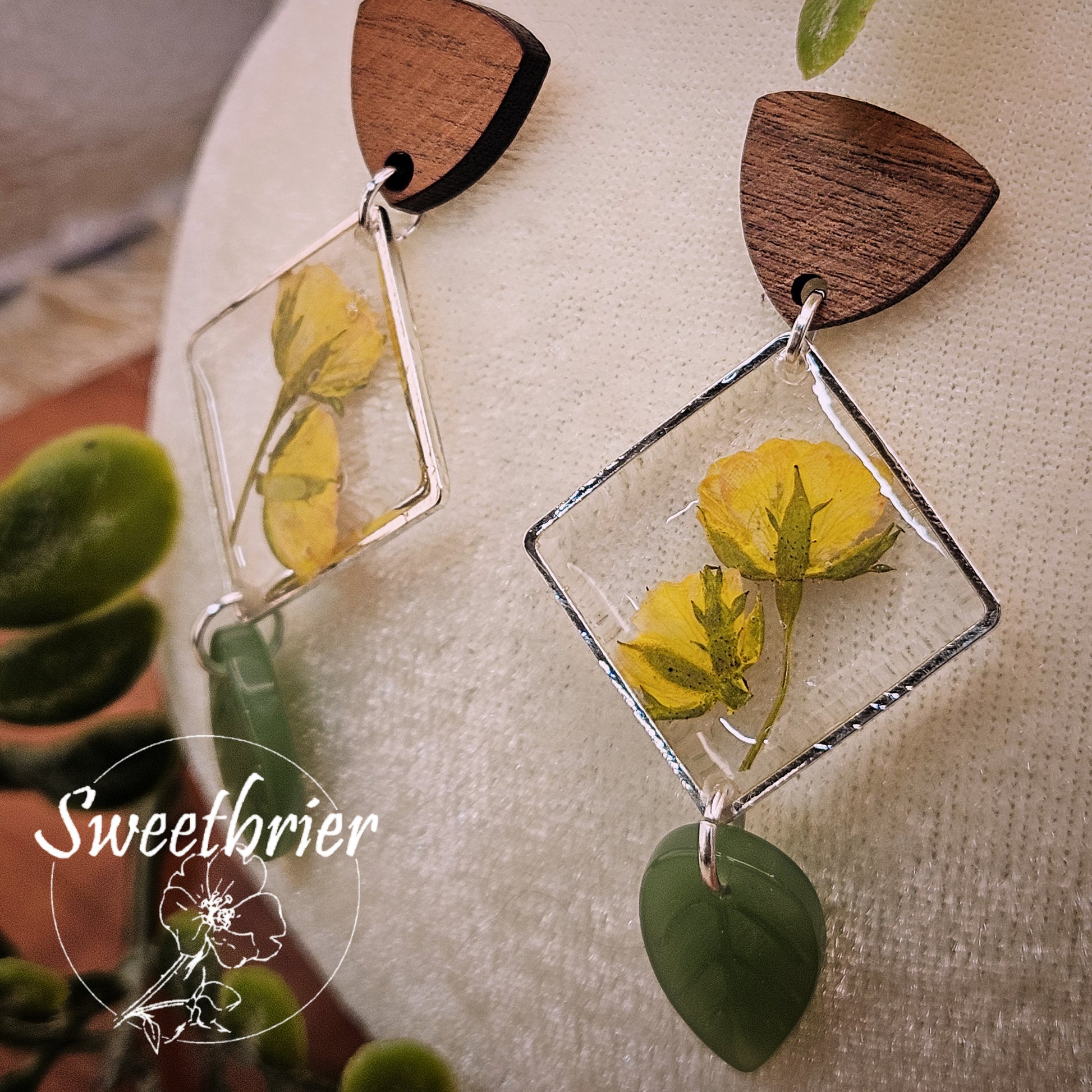 A tribute to nature’s quiet beauty, these earrings feature delicate yellow blooms preserved in clear resin and framed in a diamond design. The rich wooden stud topper and smooth glass leaf accent create a balanced blend of earthy warmth and fresh greenery. Each pair is entirely unique, capturing the fleeting charm of real blossoms.