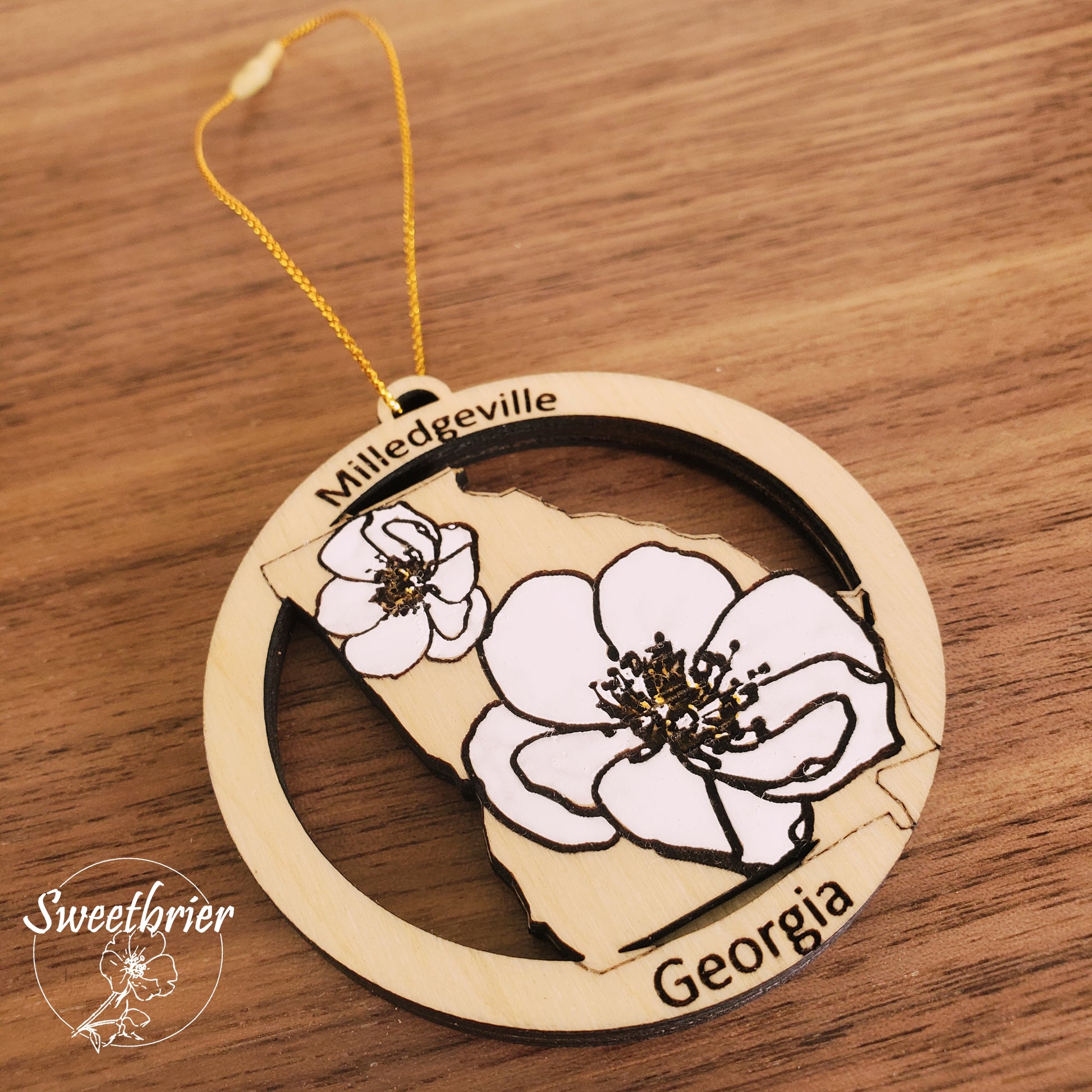 Celebrate the beauty of Georgia with this charming 2.5-inch round ornament, handpainted on both sides and crafted from durable Baltic Birch. Showcasing the stunning Cherokee Rose, the state flower of Georgia, this delightful piece from Milledgeville, GA, adds a touch of Southern charm to your holiday decor or year-round display. Perfect as a gift or a personal keepsake, it beautifully captures the essence of Georgia's natural beauty.