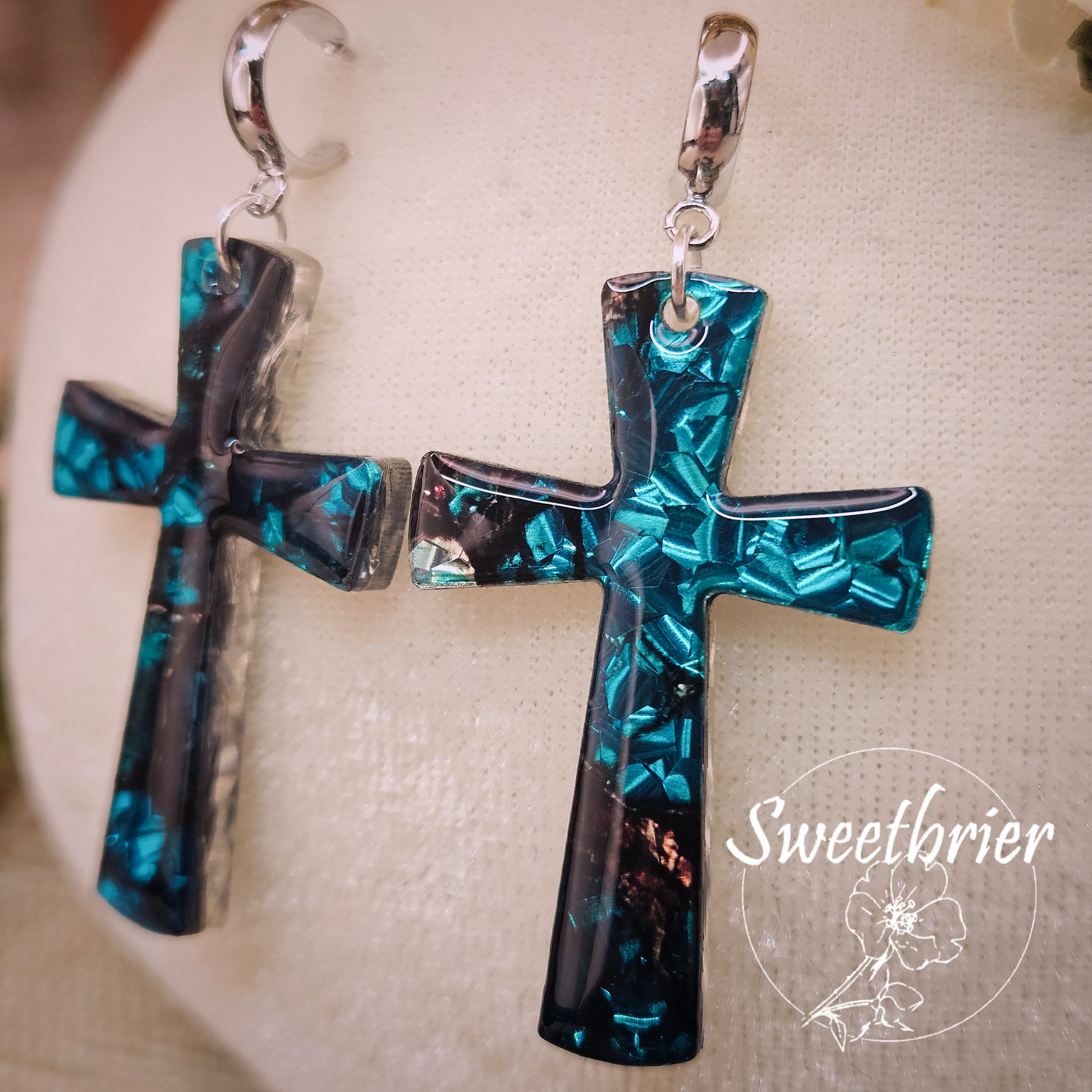 These Turquoise Radiance Cross Earrings capture the look of polished stone with a touch of shimmer. The deep turquoise acrylic is flecked with chunky glitter that catches the light, giving each pair a mesmerizing glow. Every set is one-of-a-kind, with natural-looking pattern variations that make them uniquely yours. Finished with stainless steel hardware for durability and comfort, they bring a modern sparkle to a timeless symbol.